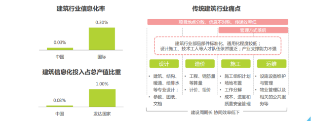 中国建筑行业整体的信息化程度较差,只有国际水平的十分之一,传统建筑行业不仅在建设过程中面临着建设周期长、资金投入大、项目地点分散、建造方式落后、管理方式粗放、盈利水平低等一系列问题,还受到建筑行业部品部件标准化、通用化程度低、各类人才短缺、产业能力不足等问题的制约,使得建筑业的工业化和数字化程度都明显落后于其他行业。而且现阶段,相对于发达国家,中国在建筑信息化的投入还比较低。另一方面,建筑业各环节信息化水平参差不齐、割裂严重。数据无法在不同阶段间进行有效流通,导致信息断层,最终表现为协同效率低下,生产效率较低。