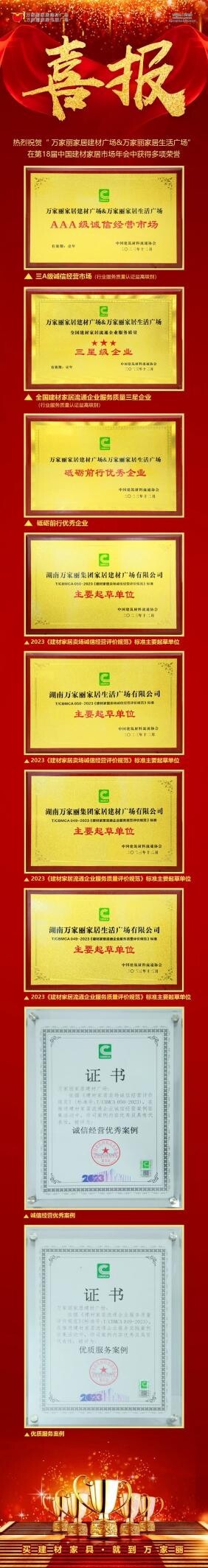 2023年12月15日,2023中国年度最佳雇主颁奖典礼举办,长沙荣获“中国最佳引才城市”称号。12月16日—17日,由中国建筑材料流通协会家居建材市场专委会主办的第18届中国建材家居市场年会在广东佛山隆重举行。万家丽家居建材广场&万家丽家居生活广场分别荣获“全国建材家居流通行业诚信经营AAA市场”“全国建材家居流通企业服务质量三星企业”“砥砺前行优秀企业”“2023《建材家居卖场诚信经营评价规范》标准主要起草单位”“2023《建材家居流通企业服务质量评价规范》标准主要起草单位”“诚信经营优秀案例”“优质服务案例”等多项荣誉。