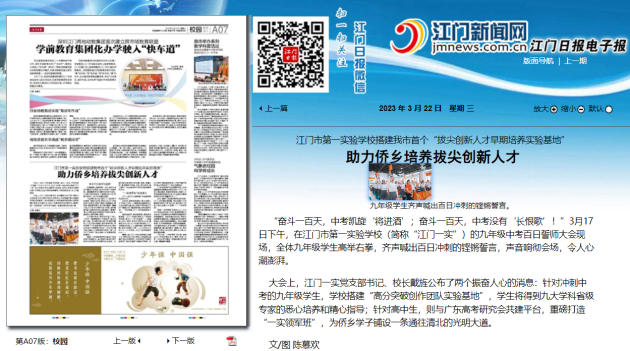 就在我们采写本报道的当天,本地机关报——《江门日报》还在重要位置刊登了——《江门市第一实验学校搭建我市首个“拔尖创新人才早期培养实验基地”,助力侨乡培养拔尖创新人才》。