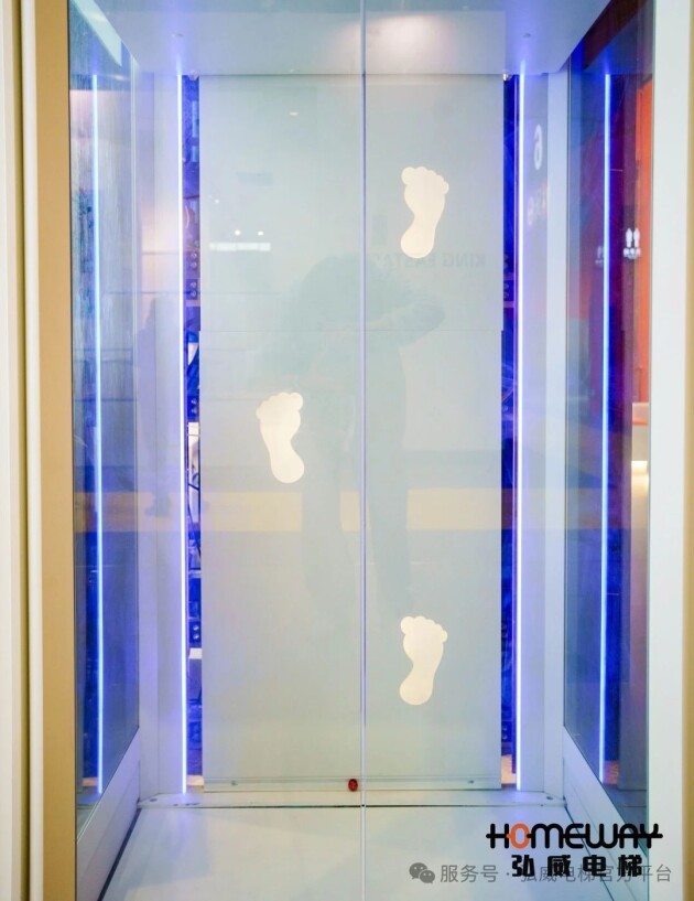 跳脱传统曳引龙门架电梯的传统结构,采用集成化设计,目之所及简练精致,所有的零部件都隐藏在井道内部,毫无视觉干扰,这便是弘威3000系列的独特设计。此次展示的3000-1系列,其井道封板精心设计了8个脚印图案,随着电梯的上升和下降依次呈现,浪漫而温馨,诠释着弘威电梯”回家的路“的品牌主题,也诉说着弘威电梯成立以来一步一个脚印,精品品质的坚守。
