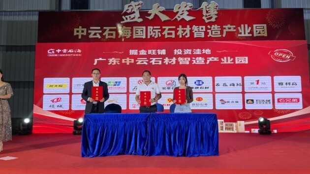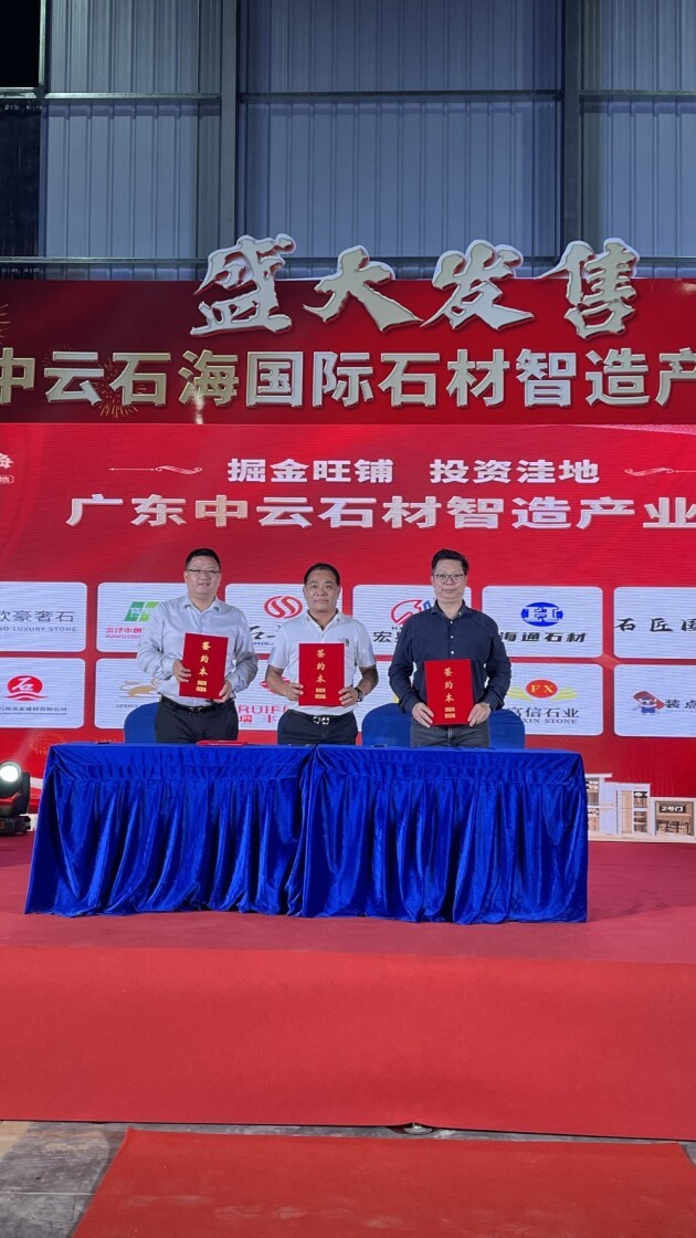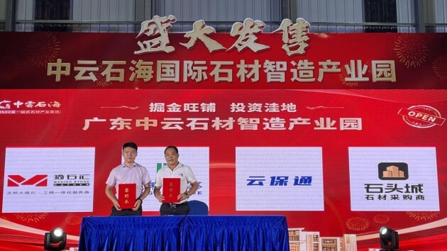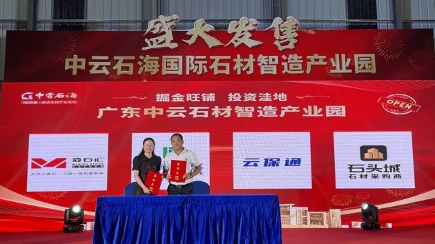 广东云浮“白石世界”再引领中国石都新方向!中云石海董事长关海棠与合营企业云浮市云保通贸易、厦门市石头城集团现场签约。