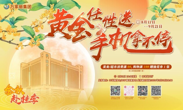 黄金任意送,手机拿不停!宇宙中心“金秋赴桂季”大抽奖重磅来袭!在宇宙中心中大奖so easy!秋日好时光,逛吃抽大奖!在万家丽国际购物广场全场单笔消费满199元,美食类单笔消费满99元,万家丽生活超市消费满99元,均有机会赢取黄金饰品、品牌手机、超市购物卡、豪华客房体验券、大牌美食券、惊喜礼包等重磅福利,9月21日活动当天,加入万家丽粉丝群并关注微信公众号或注册万家丽美妆会员还有现金红包雨、大牌美食券等惊喜福利等着你,更多活动详情请关注“宇宙中心万家丽”微信公众号!