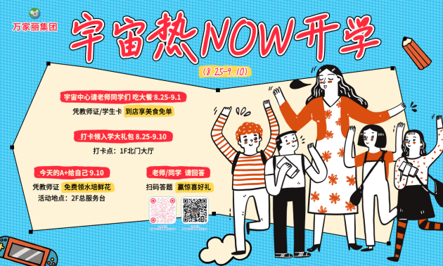 三尺讲台,几度春秋,是我们永远的眷念,在教师节到来之际,宇宙中心与您一起感念师恩。8月25日至9月10日,创意开学指南美陈来袭,打卡并任意消费,社交平台@宇宙中心万家丽,带上话题#宇宙开学变形记,即可前往2F总服务台领取开学加油包,(限量200份,先到先得)宇宙中心携手多家知名餐饮品牌,请老师同学们吃大餐!出示教师证或宇宙学生卡,即可享受专属的美食福利。更有趣味答题赢开学加油包!各科神题混搭网络热梗,表情包加持,惊喜不断! 9月10日教师节,凭教师资格证+关注小红书,国风水培鲜花免费送,为园丁添彩,共庆师恩!线上线下齐欢乐,以爱之名,赠礼教师!