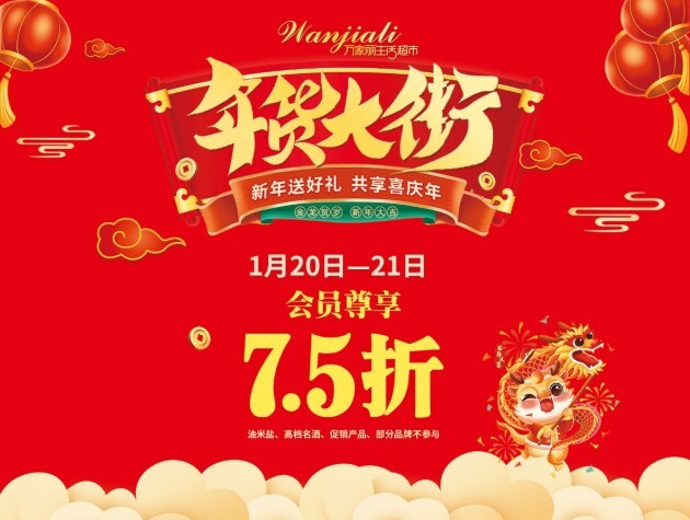 岁末来万家丽生活超市购物,福利优惠一波接一波,每周二、周三会员享8.5折(油米盐、高档名酒、特价商品不参与),且消费满额尊享免费停车,更有不定期好礼相送。要购物要囤货就来万家丽生活超市。