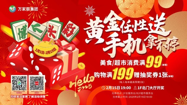 宇宙中心万家丽新春送福,“博个头彩”幸运宇宙人大抽奖,在宇宙中心万家丽全场购物单笔消费满199元,美食类单笔消费满99元,万家丽生活超市消费满99元,即可兑换抽奖券,均有机会赢取黄金饰品、品牌手机、超市购物卡、豪华客房体验券、大牌美食券,2月15日活动当天,加入万家丽粉丝群并关注微信公众号还有现金红包雨、大牌美食券、新春福气礼包等惊喜福利等着你!