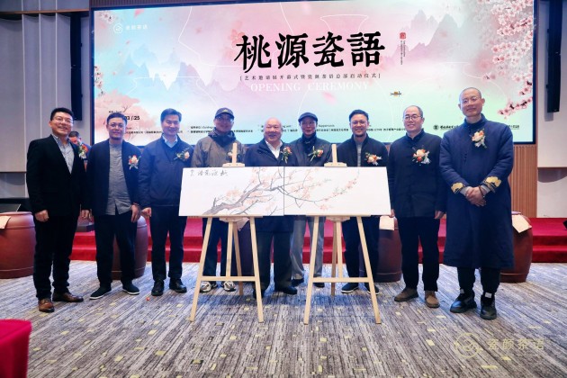 现场,杨建新先生、沈岳先生、吕伟刚先生以及“钱塘瓷画五杰”(张圣暄、傅义坤、杨斌、杨琪、杨德)8位老师共同点墨丹青,执笔留芳,桃花花开花谢,但今天我们用艺术留下她,让美好不随时间的变迁而改变。随后程渭山主任宣布桃源瓷语艺术邀请展开幕!