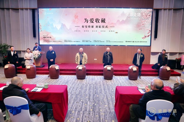 现场分享了福友界福学院院长徐麟先生真实的藏茶故事。 所有嘉宾共同见证一场即将持续三十年的为爱收藏的老白茶封缸仪式。现场封存七缸5、10、15、20、30年的老寿眉,以及采摘于2022年牡丹、白毫银针各一百斤。