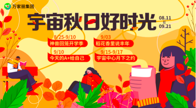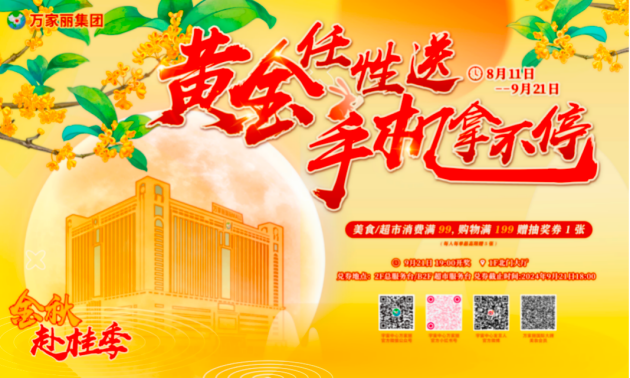浪漫秋日,万家丽精彩活动已就位,多重好礼等你来领。8月25日至9月10日,按要求完成开学季打卡任务,即可凭任意消费小票,前往万家丽2F服务台领取宇宙开学加油包。9月10日,凭借本人教师资格证,关注小红书官方账号,即可获得国风水培鲜花。9月15日至9月17日,成功完成猜灯谜游戏挑战,即可将月亮打包带走;消费满99元,并按要求完成中秋打卡任务,即可获得定制款中秋礼包。更多活动详情,欢迎关注“宇宙中心万家丽”微信公众号!