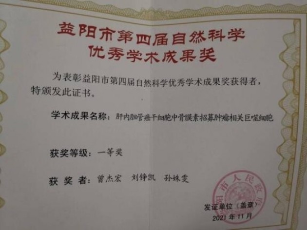 其2015年就开始研究的成果,居然在6年后还引领着医学行业和科学行业,获得湖南省益阳市政府2021年“益阳市第四届自然科学优秀学术成果奖一等奖”。
