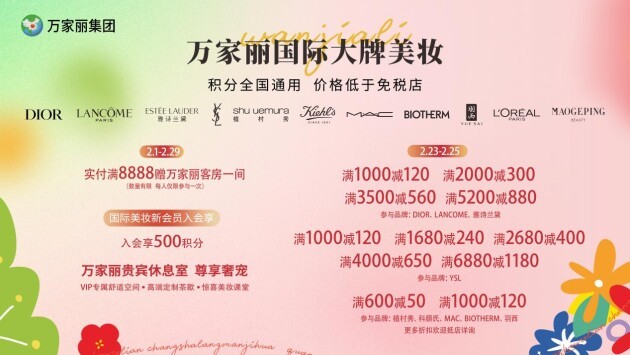 万家丽国际大牌美妆,全国积分统一通用,价格低于免税店。2月23日至2月25日,DIOR、LANCOME、雅诗兰黛,满1000减120,满2000减300,满3500减560,满5000减850;YSL满1000减120,满1680减240,满2680减400,满4000减650,满6880减1180。植村秀、科颜氏、MAC、Biotherm、羽西,满600减50,满1000减120,欧莱雅、毛戈平、林清轩、珀莱雅抵店更有超多满额买赠惊喜等着你! 2月1日至2月29日实付满8888元赠万家丽客房一间。即日起,新会员享入会即享500积分,积分最高可兑满1000减130美妆券,会员更有尊享VIP专属贵宾休息室,不定期上线美妆课堂,积分兑换好礼,给你满分宠爱,更多美妆福利,欢迎进店解锁。