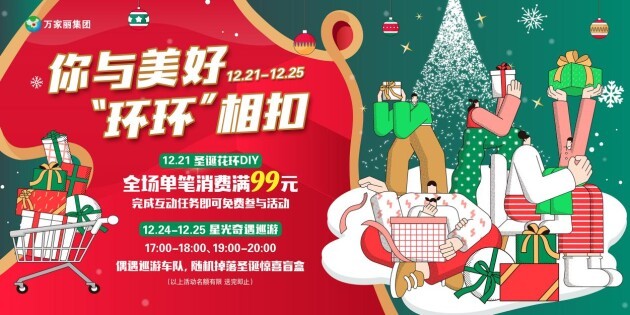 圣诞周边疯狂送!12月21日,在宇宙中心万家丽全场单笔消费满99元,完成此案长互动任务即可免费参与“圣诞花环DIY”活动;12月24日—12月25日,17:00-18:00、19:00-20:00,在宇宙中心万家丽偶遇圣诞巡游车队,随机掉落圣诞惊喜盲盒,数量有限,先领先得!更多活动详情,请关注“宇宙中心万家丽”微信公众号!