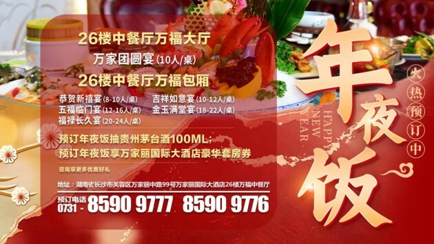 万家丽国际大酒店献礼新春飨宴,年夜饭超值预售1888元起,一流专业大厨精心烹煮数道珍馐佳肴,团圆心意尽在这一席年味盛宴之中。酒店万福中餐厅汇聚中国八大菜系精髓,更有菜品上新,由世界级烹饪大师匠心打造冬季时令菜品,只为让您享受冬日美好“食”光!即刻预订尊享多重福利,免费参与贵州茅台酒、自制梅菜扣肉等豪礼抽奖,每桌赠酒水饮品、果盘餐点和全家福拍立得照片一张。万福中餐厅打造全家齐乐的团聚时光,28个特色包厢及大厅可供选择,用餐环境高雅,为您呈现缤纷美馔。酒店餐饮预订热线:0731-85909777、0731-85909776。