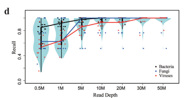 吉因加真菌(巴西曲霉)检出限低至100 CFU/mL,优于行业标准5倍。2021年,中国食品药品检定研究院病原mNGS项目组在《深入病原mNGS技术质量控制与评价研究 探索建立创新型体外诊断试剂质量评价体系》一文中指出:现阶段病原mNGS检测试剂可以在24小时检测周期内,20M测序数据量的条件下,在含有1×10^5 cells/mL人源背景的样本中测到浓度≥500 CFU(或copies)/mL的病原微生物。