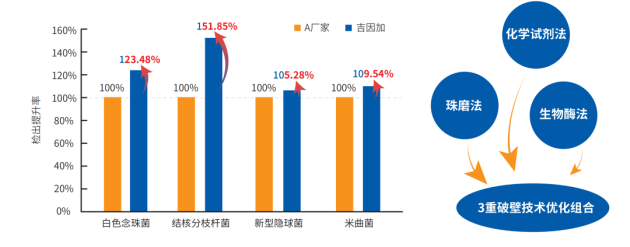 吉因加进行物理、化学、生物三种破壁技术的优化组合,有效提升白色念珠菌、结核分枝杆菌、新型隐球菌、曲霉等特殊、难检病原体的检出率,同时保障其他病原检出不受影响。