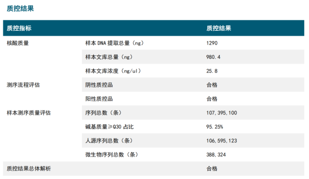 四大维度质控监测展示:核酸质量、测序质量、全流程评估(阴性对照、阳性对照)、质控结果总体解析。质控结果的实际检测数据清晰展示,更客观、更透明。