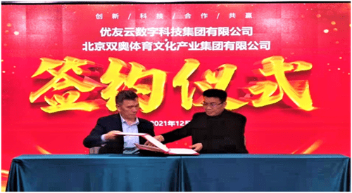 双奥体育文化产业集团董事长尤小龙(右)、中控文旅集团董事长、优友云数字科技集团总裁殷宝华(左)